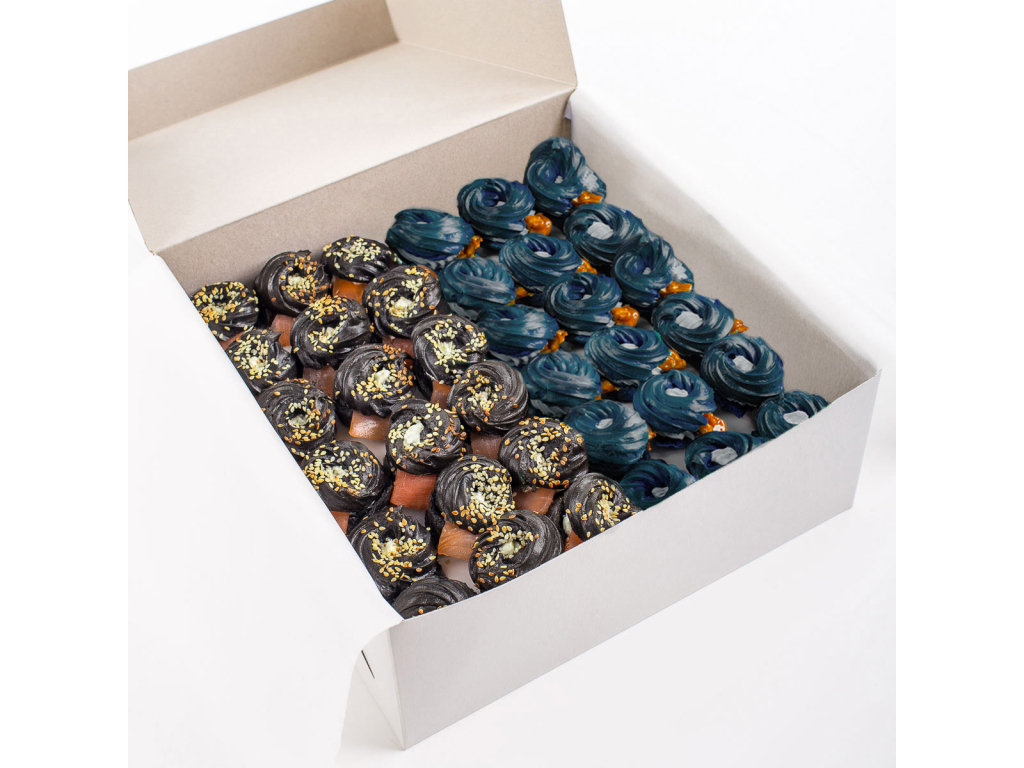 Majestátní černý mini Věneček jako protipól sladkých příchutí. Slaný korpus se sezamovým semínkem ukrývá koprové lůžko z krémového sýra, na němž se vyjímá lahodný plátek uzeného lososa s kapkou citronu. Všechny ingredience dohromady tvoří gentlemana ve fraku, s nímž zazáříte na každém večírku.
