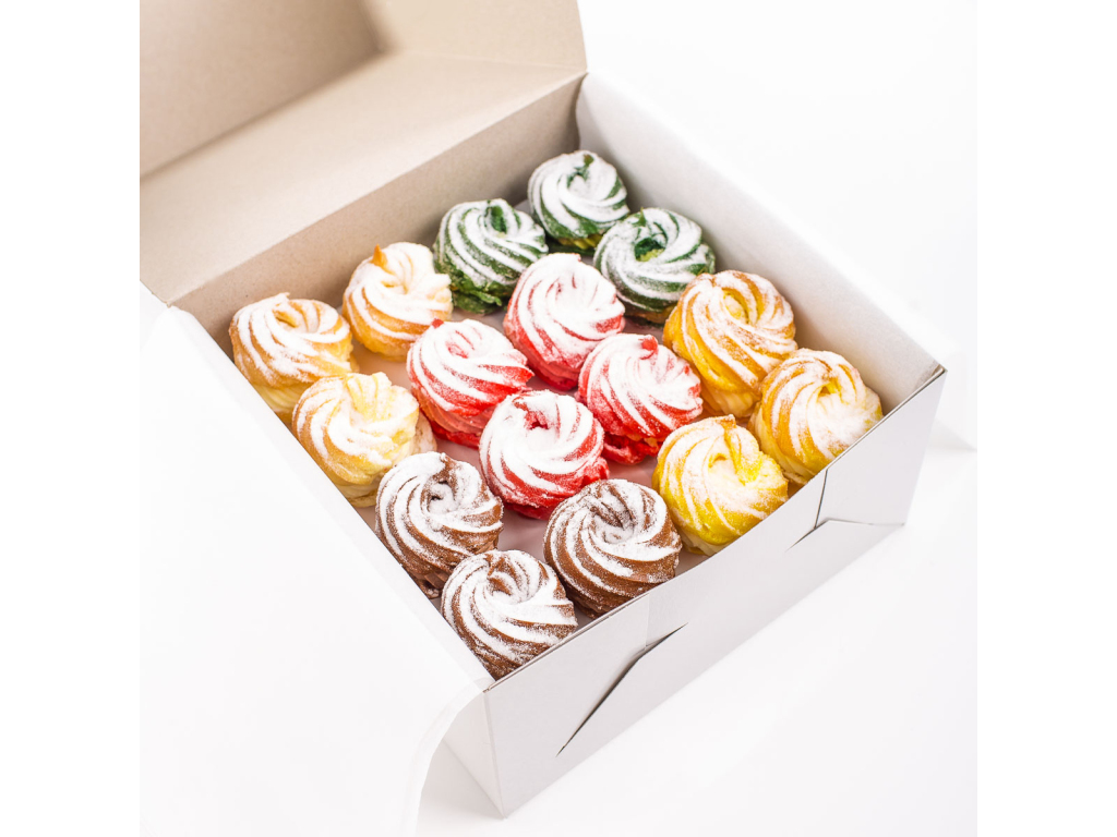 Alergeny: Věnečky s máslovým krémem, Baileys, jahodové, citronové a maracuja 1, 3, 7. I Pistáciový a griliášový 1, 3, 7, 8. I Čokoládový 1, 3, 6, 7, 8.