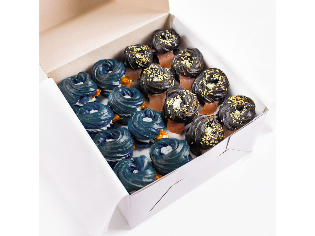 Majestátní černý mini Věneček jako protipól sladkých příchutí. Slaný korpus se sezamovým semínkem ukrývá koprové lůžko z krémového sýra, na němž se vyjímá lahodný plátek uzeného lososa s kapkou citronu. Všechny ingredience dohromady tvoří gentlemana ve fraku, s nímž zazáříte na každém večírku.