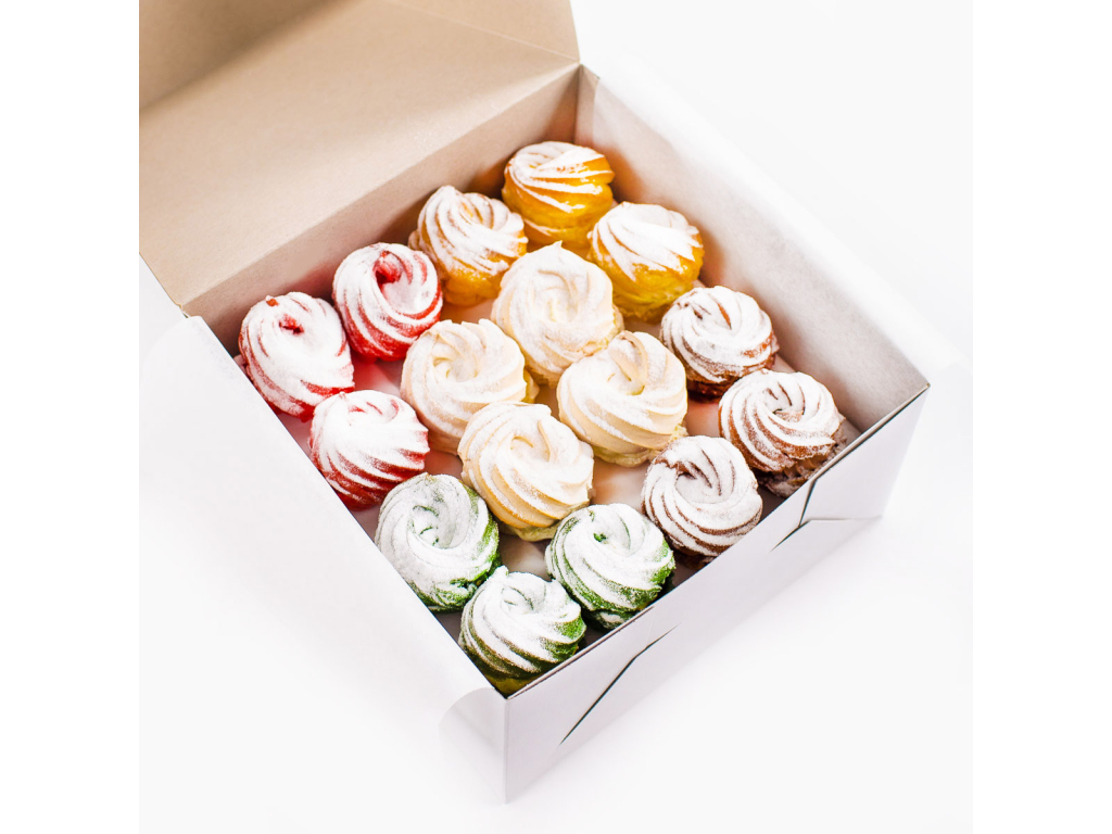Alergeny: Věnečky s máslovým krémem, Baileys, jahodové, citronové a maracuja 1, 3, 7. I Pistáciový a griliášový 1, 3, 7, 8. I Čokoládový 1, 3, 6, 7, 8.